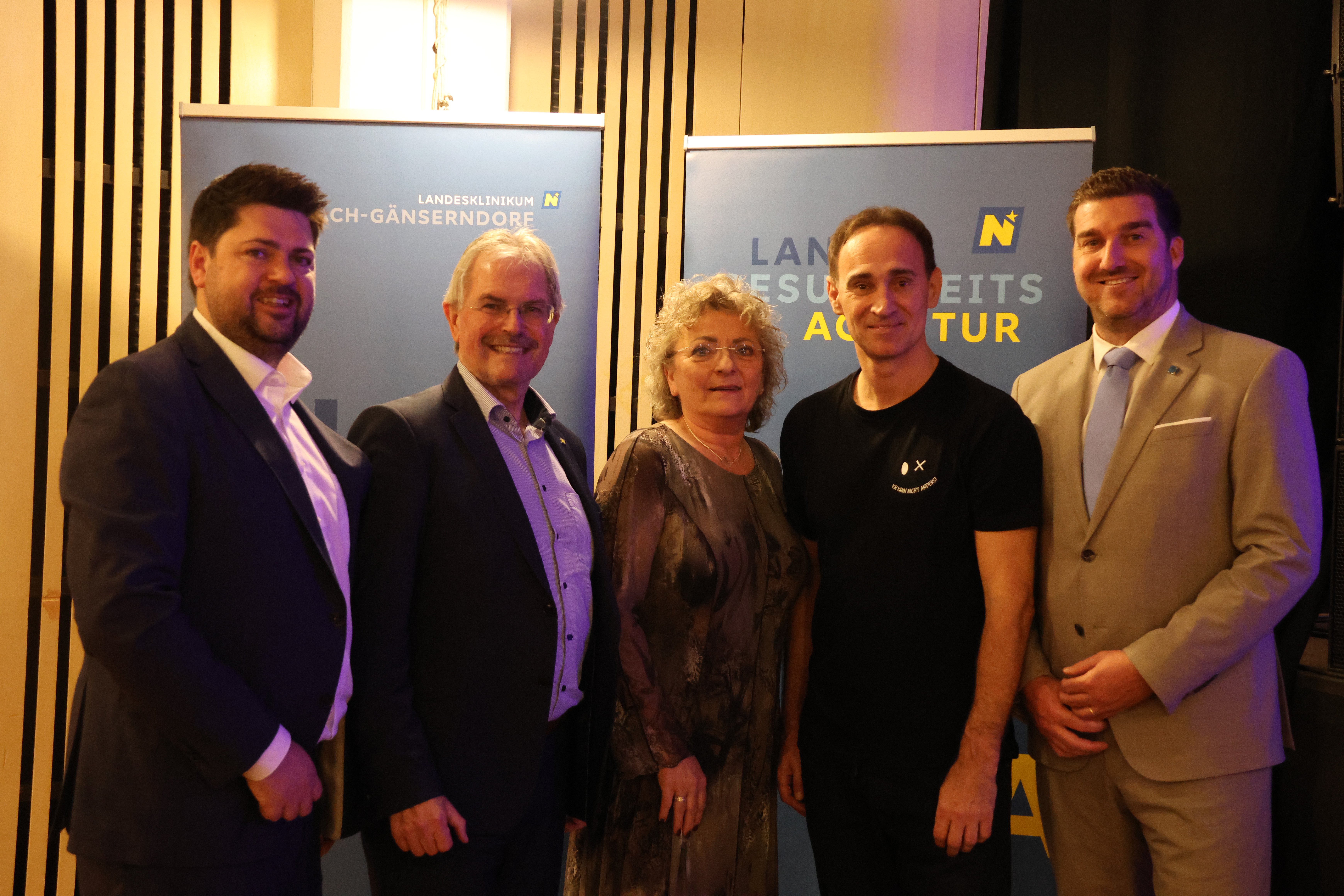 Das Landesklinikum lud zum Kabarettabend: Pflegedirektor PhDr. Christian Pleil, MSc MLS MBA, Landtagspräsident Karl Wilfing, Organisatorin Dagmar Watzl (Assistentin Kaufmännische Direktion), Gernot Kulis und Kaufmännischer Direktor Florian Trummer, MLS MBA.