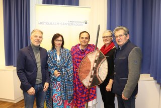 DGKP Silvia Denner (Zentral-OP) und Urologie-Oberarzt Dr. Stefan Heidler (Mitte) in der traditionellen Kleidung der Massai mit dem Ärztlichen Direktor Dr. Christian Cebulla, der Kaufmännischen Direktorin Jutta Stöger, MSc und Pflegedirektor DGKP Josef L. Strobl, akad. PD (v.l.)